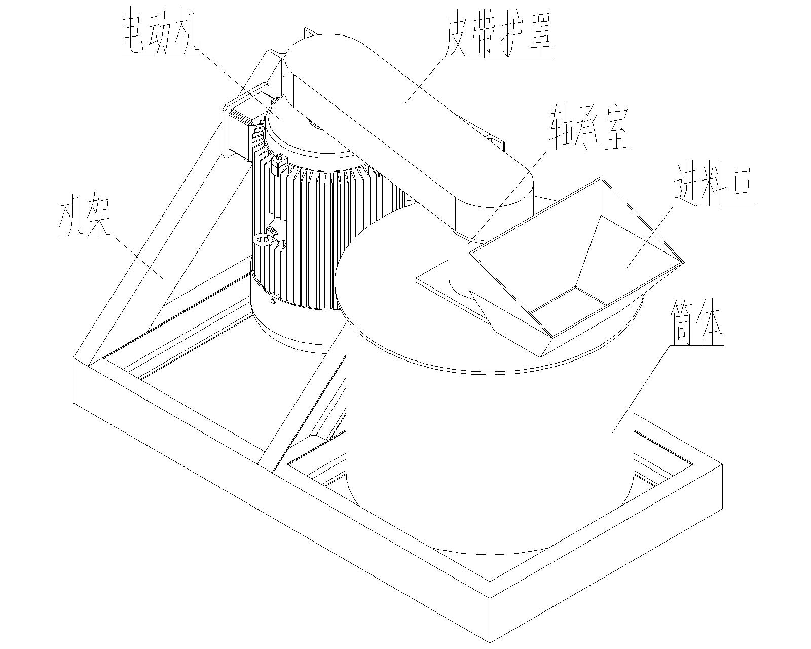構(gòu)造組成:結(jié)構(gòu)由下機(jī)架、機(jī)殼、上下軸座、主軸、轉(zhuǎn)子盤、鏈條、錘頭、皮帶輪、電機(jī)架等部份組成。動(dòng)力經(jīng)三角帶帶動(dòng)主軸旋轉(zhuǎn),主軸有上下兩個(gè)軸承座,軸承座安裝在機(jī)殼的上端和下端。機(jī)殼總成安裝在下機(jī)架上,主軸上裝有轉(zhuǎn)子盤和鏈條,加料斗裝在機(jī)殼上部,為了裝卸錘頭方便,機(jī)殼上開(kāi)有活門,便于拆裝維修。